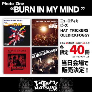 ニューロティカ、ピーズ、HAT TRICKERS、OLEDICKFOGGYが出演する『TATAMI MATSURI Lv.40』のタイムテーブルが公開。カメラマンたたみ撮影によるPHOTO ZINE『BURN IN MY MIND』が4種類各40冊限定販売