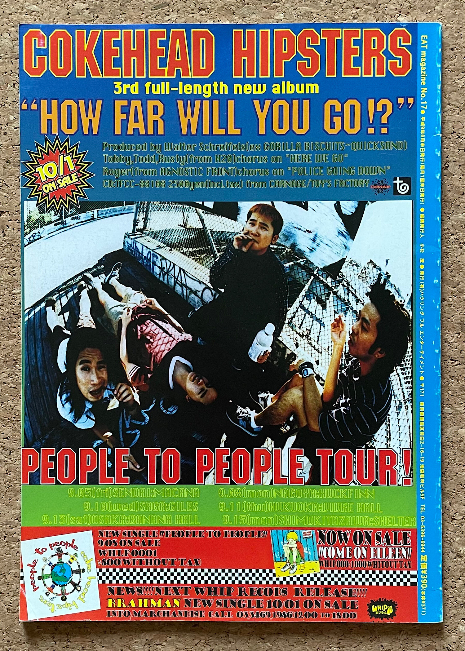 ちなみに、表紙には「people to people」の7インチや封入されていたフライヤーと同様に「COKE HEAD HIPSTERS」と記載されています。「COKE」「HEAD」「HIPSTERS」。ところが、裏表紙の広告は「COKE」と「HEAD」の間にスペースがありません。