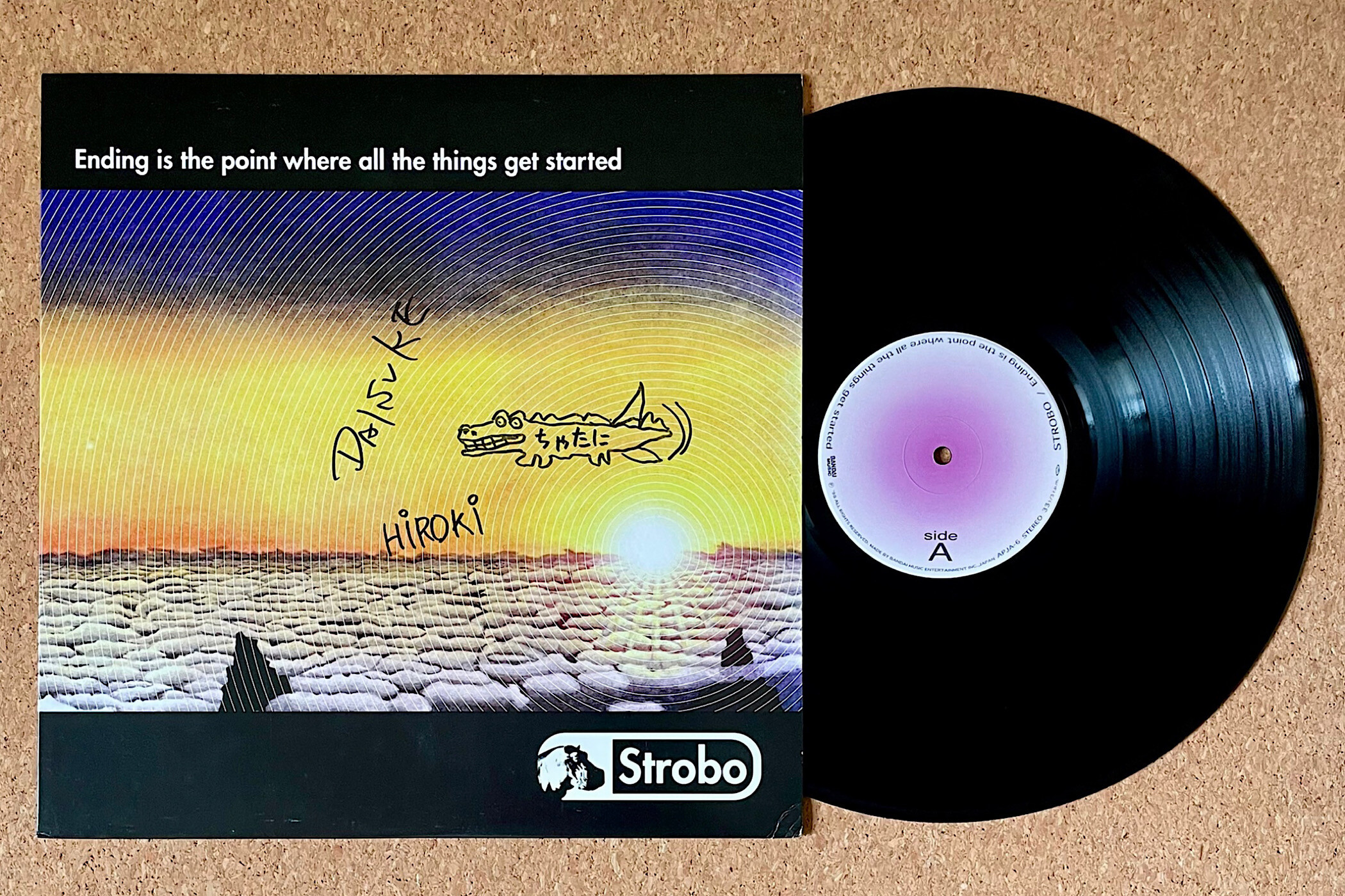 画像は、STROBOのメンバーからいただいた見本盤LP。HIROKI氏(g, vo)、DAISUKE氏(b)、CHATANI氏(ds, vo)のサイン入りです。