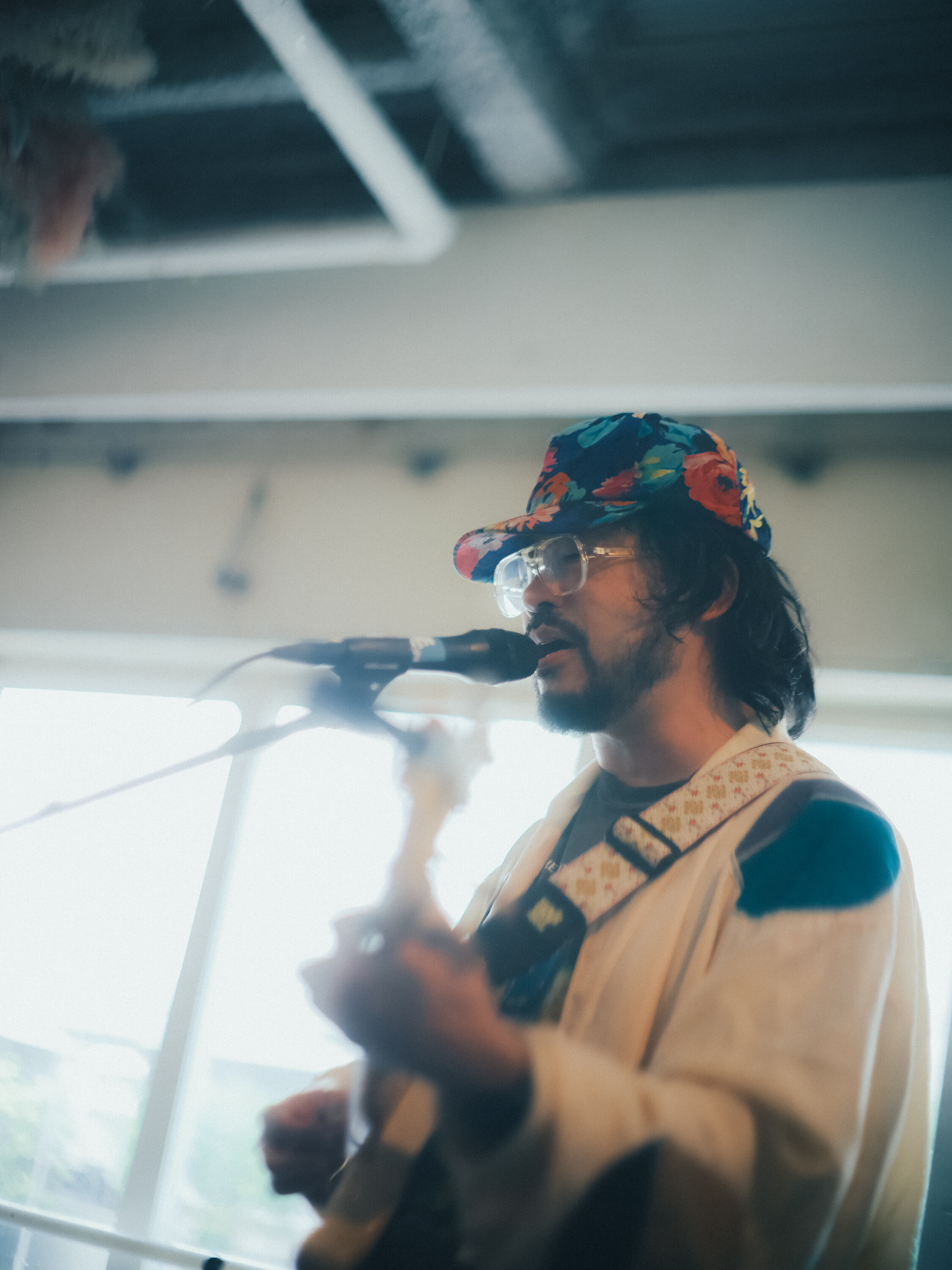 ヤスエ:映像みたいなものは、常に思い浮かべて、ぼんやりと頭の中で見えてるものを、丁寧に言葉で模っていくというか、輪郭をつけていくっていう感じで詩も曲も作ってる。作曲もギターを弾かないのがモットーで。弾かないで空歌にコードをつけるから、コードの押さえ方も俺コード。1弦1弦、頭の中で響いている音感を取りにいくから、押さえ方もむちゃくちゃ。たぶん音楽やってる人からすると難しいコード進行。変なコード進行で変な押さえ方をしてるんだけど、それはもうナチュラルに、そこで響いている音を1個1個取っていったら、そのコードにたまたまなった、っていう作り方なんですよね。