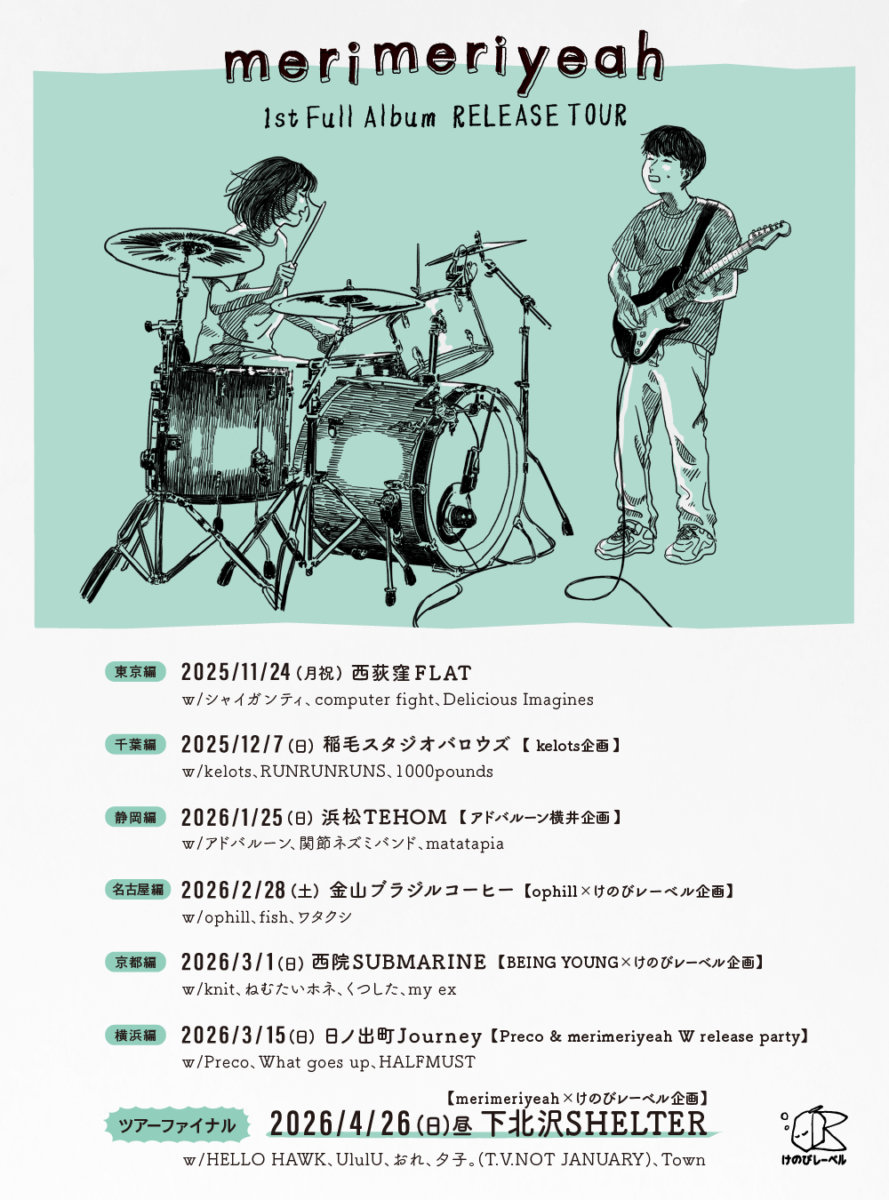 ──メリメリの活動を追っているとメリメリを中心にいろんな人たちが新しい輪を作っていっていて、それがずっと続いてる、っていうのを強く感じる。レコ発がまた新しい出会いとかつながりのきっかけになる気もする。3月のリリースツアー京都編、よろしくね。