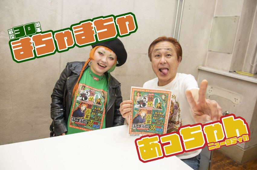 機知に富んだ毒舌漫談や舌鋒鋭いツッコミが人気を呼ぶ関東吉本女芸人の最年長、まちゃまちゃの芸歴30周年と誕生日を祝うライブ『まちゃまちゃ30年祭&生誕祭「独身披露宴」』が5月7日(木)にZepp Shinjuku (TOKYO)で開催される。氣志團、ギターウルフ、怒髪天、ピーズ、ニューロティカというもはや彼女の親戚もしくは身元保証人と呼んでも過言ではない百戦錬磨の強者バンド5組が祝宴に参列。バンドを中心とした音楽ライブとお笑いの融合型イベントで、まちゃまちゃの唯一無二の世界感を存分に味わえる一夜限りの特別なライブだ。10年前に行なわれた『20才祭』の実に3倍のキャパで行なう一世一代の大博打を前に、これまで数々のライブ共演を果たし、ピエロメイクのまちゃまちゃがカバーアルバム『PUNCH! PUNCH! PUNCH!』のジャケットを飾ったり、2020年まで営業していた高円寺のスナックを「ピエロ」と命名するなどかねてより親交の深い、ニューロティカのアツシを迎えて対談を敢行。ジャンルも世代も違えど何があっても義理とパンクだけは大切にして生きてきた両者のちぐはぐな88〈ややうけ〉トークをご堪能ください。(Interview:椎名宗之 / Photo:丸山恵理)