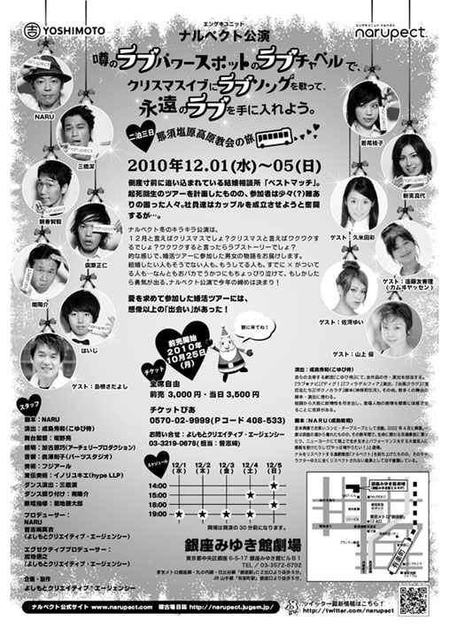 演劇ユニット ナルペクトの今回の公演は、12月でしょ? クリスマスでしょ? 恋愛しちゃうでしょ? 的な感じで、婚活ツアーに参加した男女の物語をお届けします。