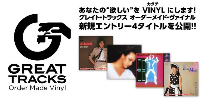 GREAT TRACKS Order Made Vinylでは今後も様々なリリースを予定、 ファンからの商品リクエストを随時募集している。 リクエストはかつてリリースしたタイトルのストレートリイシューにとどまらず、 CDのみのリリースだったタイトルの新規アナログ化、 また、 シングルとして新規リカット等の企画も大歓迎。 さらに、 アナログマニアで知られる各界著名人のプロデュースによる商品化など、 ここでしか手に入らない魅力的なアイテムをリリースする模様。 是非チェックして頂きたい。