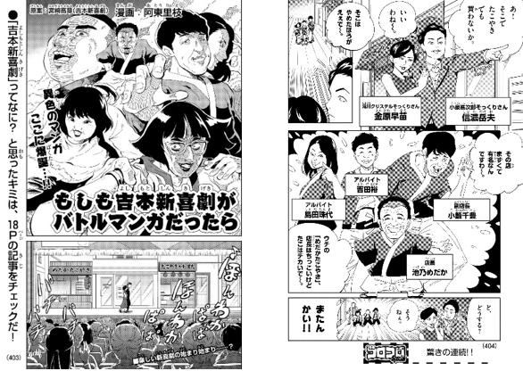 吉本新喜劇が少年漫画誌「コロコロコミック」(小学館)とコラボ した、 特別ギャグまんがが誕生。小籔千豊、 川畑泰史、 すっちー、 酒井藍 の4座長に加えて、 島田珠代、 吉田裕 、 さらには 池乃めだかや島田一の介 といったベテラン座員までもが登場し、 コロコロコミック誌上を舞台に暴れまわる。