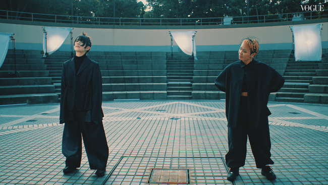 撮影当日、 それぞれダンスの雰囲気や動きに合わせた衣装を厳選し、 ヘアメイクも済ませた 2 人は久々 に再会。 ステージとなる屋外のロケーションで、 いよいよ本番がスタート。 ダイナミックな振りや“静”と “動”を表した動き、 ダンスの途中で階段を駆け上がるなど、 全身を使った動きと 2 人のシナジーがロケー ションと一体化し、 画面いっぱいに世界観が広がる。 カットの声がかかると、 それまでの真剣な表情から 笑顔がこぼれ、 ハイタッチでお互いをたたえ合った。