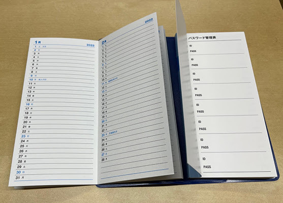 ハヤシ印刷のパスワード手帳は、 スケジュール帖とパスワード管理帖のシンプルな2部構成。 単純にIDとPASSが書き込めるようになっている。 絶対忘れたらダメなものだけでも自分だけがわかるようにメモを取っておいて、 いつも持ち歩けるように、 縦長の手帳サイズでスーツの胸ポケットに忍ばせておける。 販売価格は1冊1200円。 名入れなども可能。