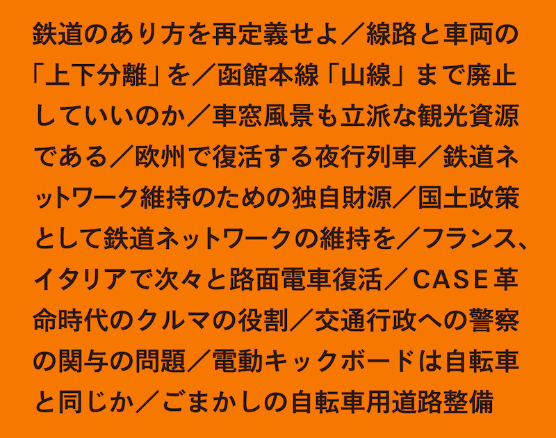 日本の交通行政は「部分最適」の集合体である。新幹線の延伸によって寸断される在来線のネットワーク。欧州で復活続くも日本では広まらない路面電車。自転車に加え電動キックボードも乗り上げカオス化が進む歩道。権限を警察が握り、「まちづくり」の観点での施策が進まない道路行政……。そろそろ全体最適を意識した総合的な交通政策を構想すべきではないか。都市・交通問題に精通したジャーナリストによる提言。