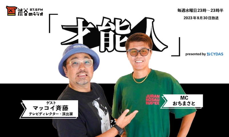 おちまさとのラジオ番組『才能人』(渋谷のラジオ 87.6MHz 毎週水曜日 午後11時~)8月30日放送回のゲストに、テレビディレクター、演出家、テレビプロデューサーとして、数々の人気番組を手掛けてきたマッコイ斉藤が出演する。