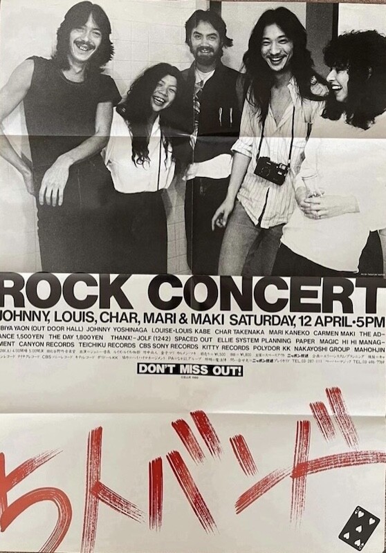 ▲ROCK CONCERT / 1980年4月、ジョニー、ルイス&チャーにカルメン・マキ、金子マリを加えた、5人バンドによる一夜のライブ時に販売されたTシャツ、ポスター付きパンフレットから。