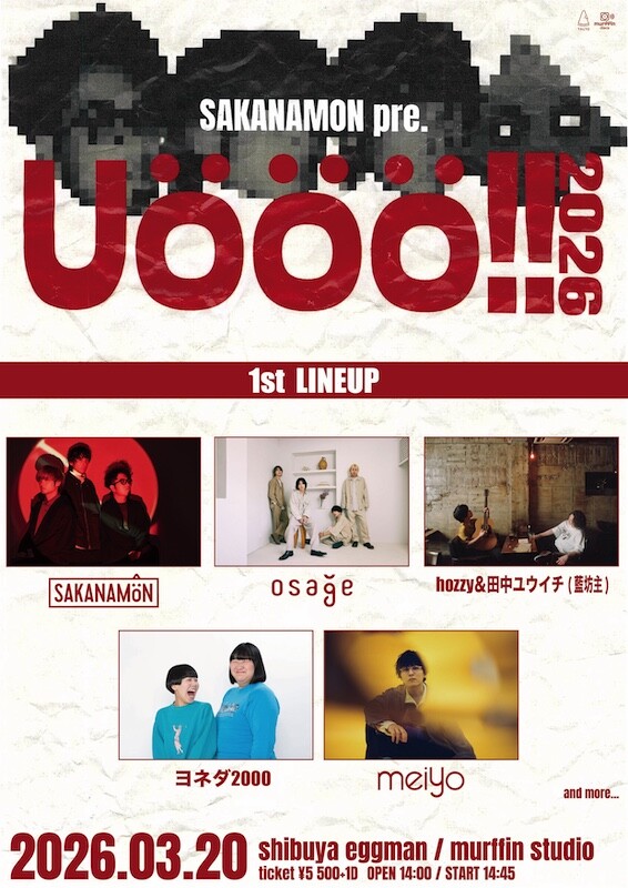 SAKANAMONが2026年3月20日(金・祝)にshibuya eggmanとmurffin STUDIOにて開催する初の主催サーキットフェス『UOOO!! 2026』の第一弾ゲストとして、osage、hozzy&田中ユウイチ(藍坊主)、ヨネダ2000、meiyoの4組を発表した。