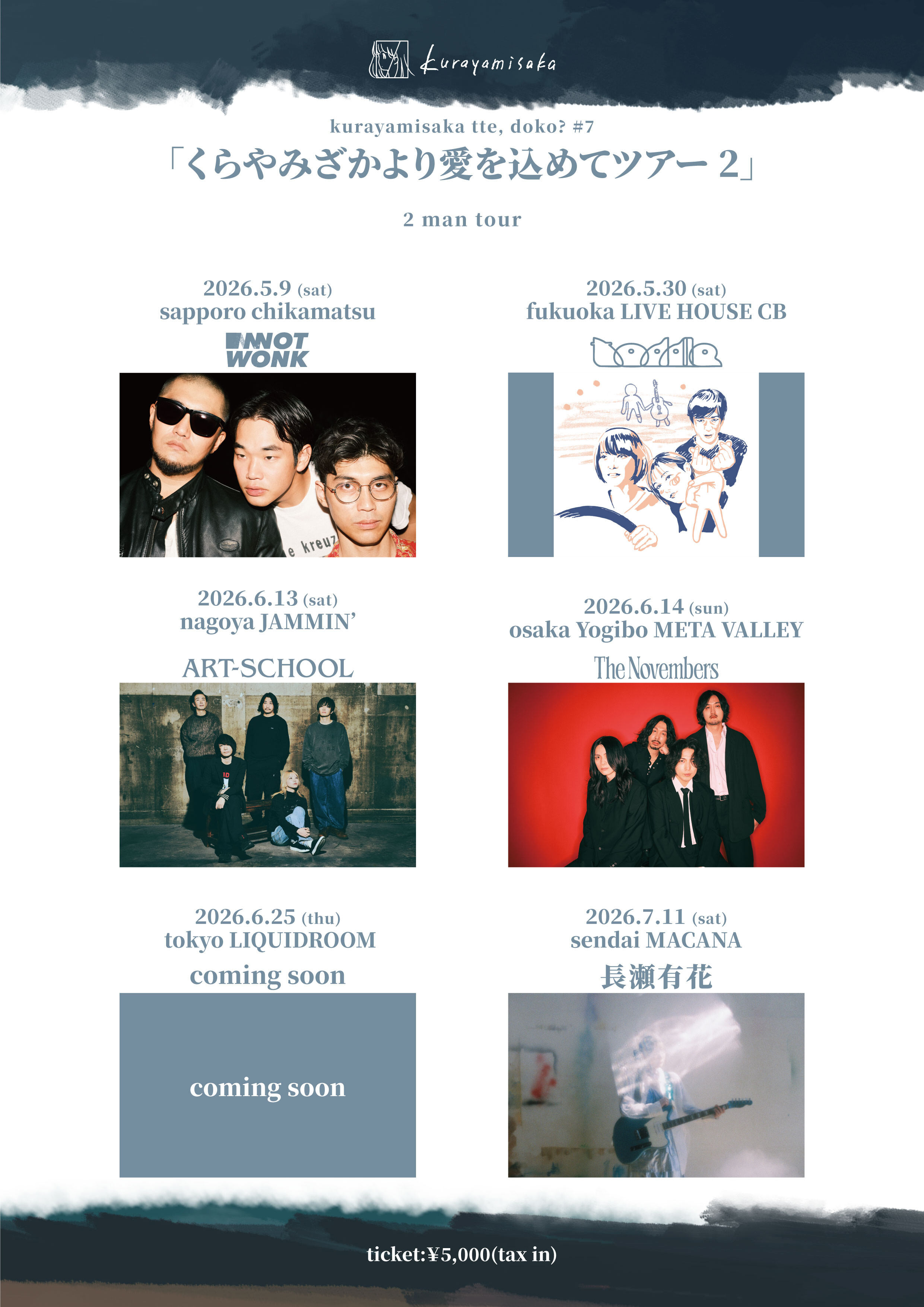 kurayamisakaが2026年5月から7月にかけて6都市を回る、ライブハウスツアー『くらやみざかより愛を込めてツアー2』に参加のゲストアーティスト5組を発表した。