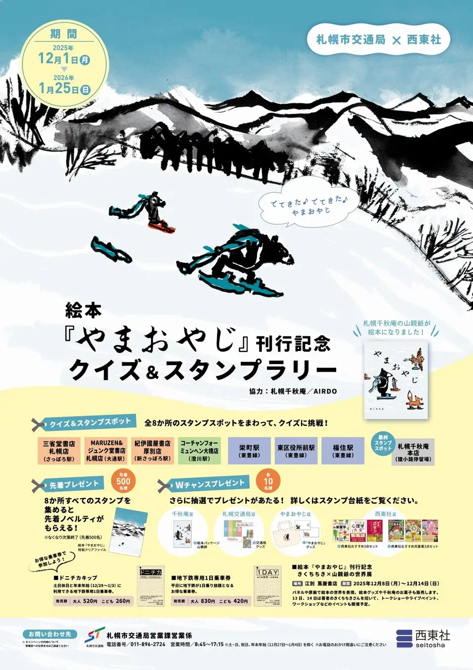 11月25日(火)から市営地下鉄全49駅、参加4書店、札幌千秋庵本店にてスタンプ台紙を順次配布開始する。8カ所すべてのスタンプを集めた方先着500名に、札幌千秋庵本店にて「絵本『やまおやじ』特製クリアファイル」をプレゼント。ほかにもWチャンスプレゼントとして、特別絵本パッケージ千秋庵「山親爺」や、『やまおやじ』グッズ、札幌市交通局グッズ、西東社の書籍が抽選で合計50名様に当たる。