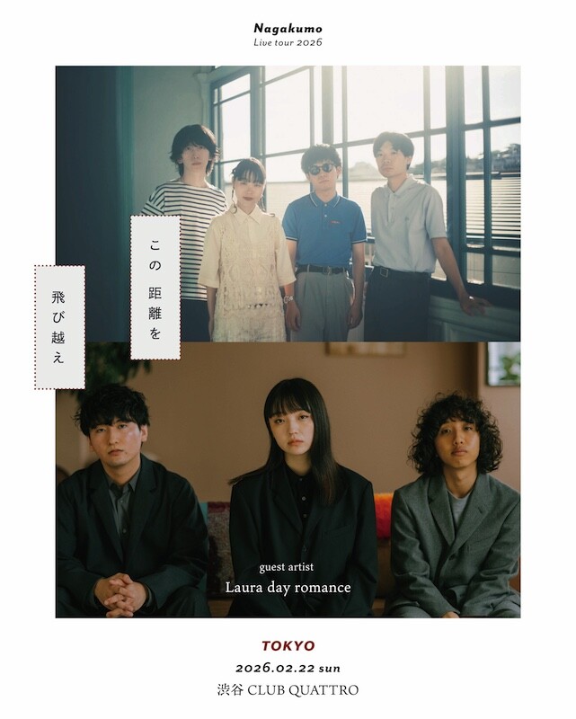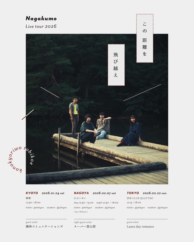 『White Dish, Blue Spoon』のリリースを皮切りに、全国3カ所を周るNagakumoのツアー『Nagakumo Live Tour 2026 “この距離を飛び越え”』の各地対バンアーティストが発表された。
