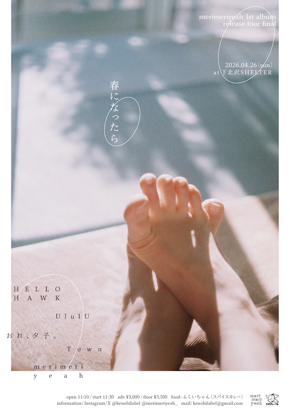 「merimeriyeah×けのびレーベル企画 “春になったら” -merimeriyeah 1st album release tour final-」は、2026年4月26日(日)下北沢SHELTERにて昼11:30より開催。