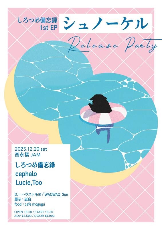 また、リリースに伴い、12月20日(土)西永福JAMにてしろつめ備忘録 1st EP『シュノーケル』リリースパーティーを開催。ゲストにはcephaloやLucie,Tooを迎えつつ、DJや展示、フードなど様々なカルチャーをライブハウスに詰め込んだ企画となっている。チケットはぴあにて販売中。