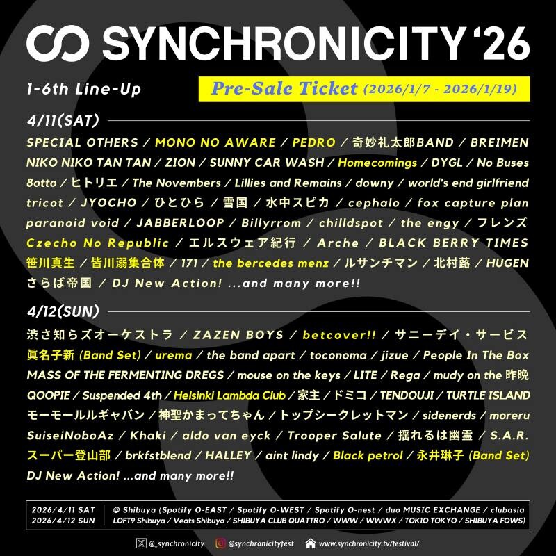 2026年4月11日(土)、4月12日(日)に東京・渋谷にて開催の都市型フェスティバル『SYNCHRONICITY’26』の第6弾ラインナップに、MONO NO AWARE、betcover!!、PEDRO、Homecomings、Helsinki Lambda Club、urema、スーパー登山部、眞名子新(Band Set)、Czecho No Republic、the bercedes menz、笹川真生、皆川溺集合体、Black petrol、永井琳子(Band Set)の合計14組が発表された。第1弾〜第5弾の発表と合わせて合計82組の出演が決定。