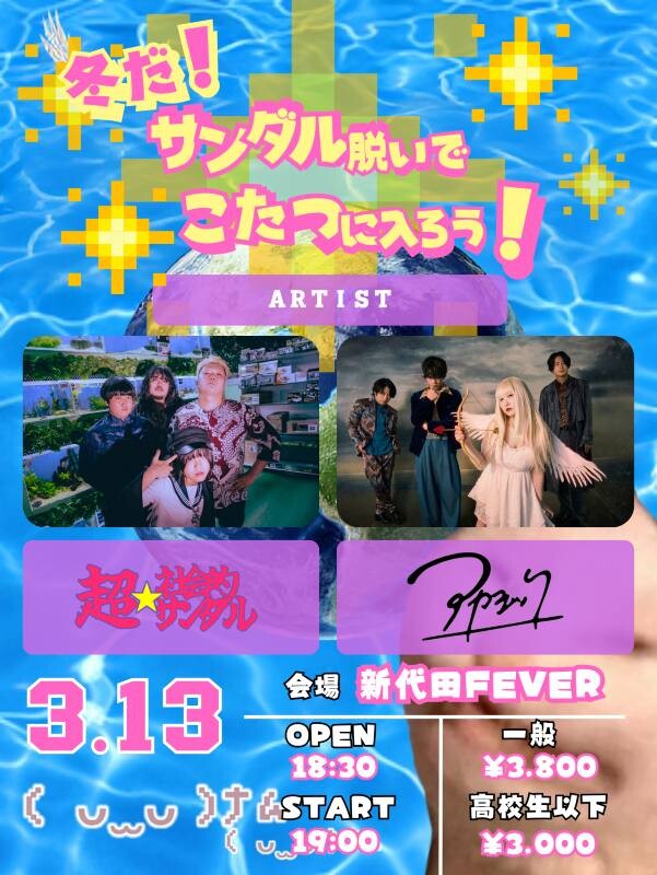 ロックバンド・超☆社会的サンダルによる冬の主催企画ライブ『冬だ!サンダル脱いでこたつに入ろう!』が、3月13日(金)に東京・新代田 FEVERにて開催されることが決定した。あわせて、対バンゲストとしてアカシックの出演が発表された。