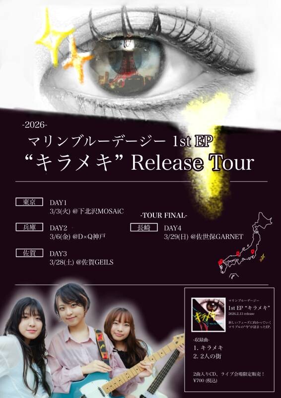 平均年齢18歳の長崎出身ガールズバンド・マリンブルーデージーが、初のEP作品となる「キラメキ」を配信リリースし、本作を携えて3月に1年ぶりのショートツアーを開催することを発表した。