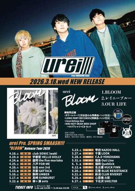 さらに、リリースに伴い、urei Pre.「SPRING SMAASH!!! “BLOOM” Release Tour 2026」の開催も決定。4月18日(土)福島・club SONIC iwaki公演を皮切りに、6月27日(土)東京・下北沢SHELTER公演まで全国18公演を実施する。4月開催公演のチケット一次先行受付は、2月22日(土)15:00から3月10日(火)23:59まで。