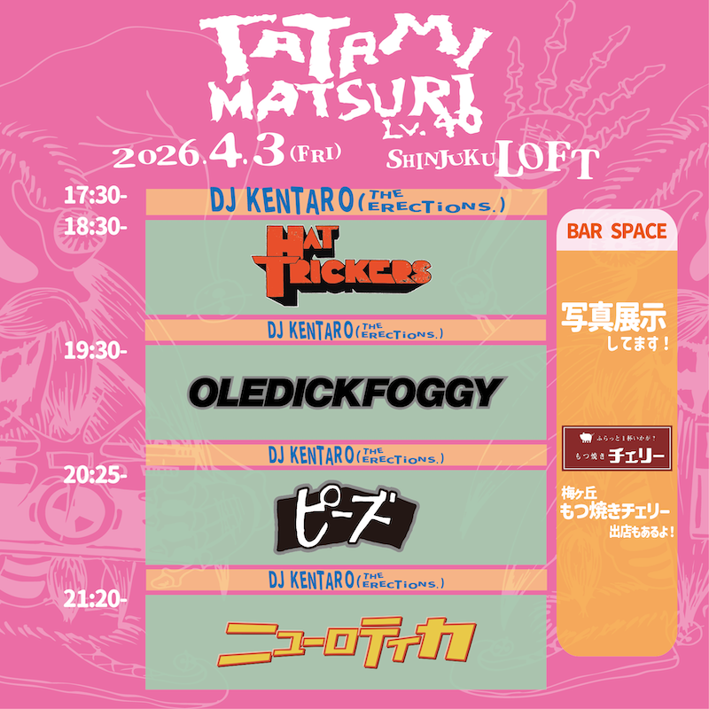 ライブハウスを中心にカメラマンとして活動するたたみが40歳の節目を記念して、ニューロティカ、ピーズ、HAT TRICKERS、OLEDICKFOGGYが出演する自主企画『TATAMI MATSURI Lv.40』を4月3日(金)に新宿LOFTで開催する。