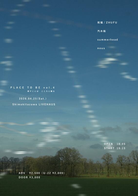 また、4月25日(土)東京・下北沢LIVE HAUSにてリリースパーティー『PLACE TO BE Vol.4 - 耕すことば こころと踊る-』を開催。祝福 / ZHUFU、汽水船、summerheadといった個性豊かなアクトが出演し、オルタナティヴシーンの現在を体感できる一夜となりそうだ。