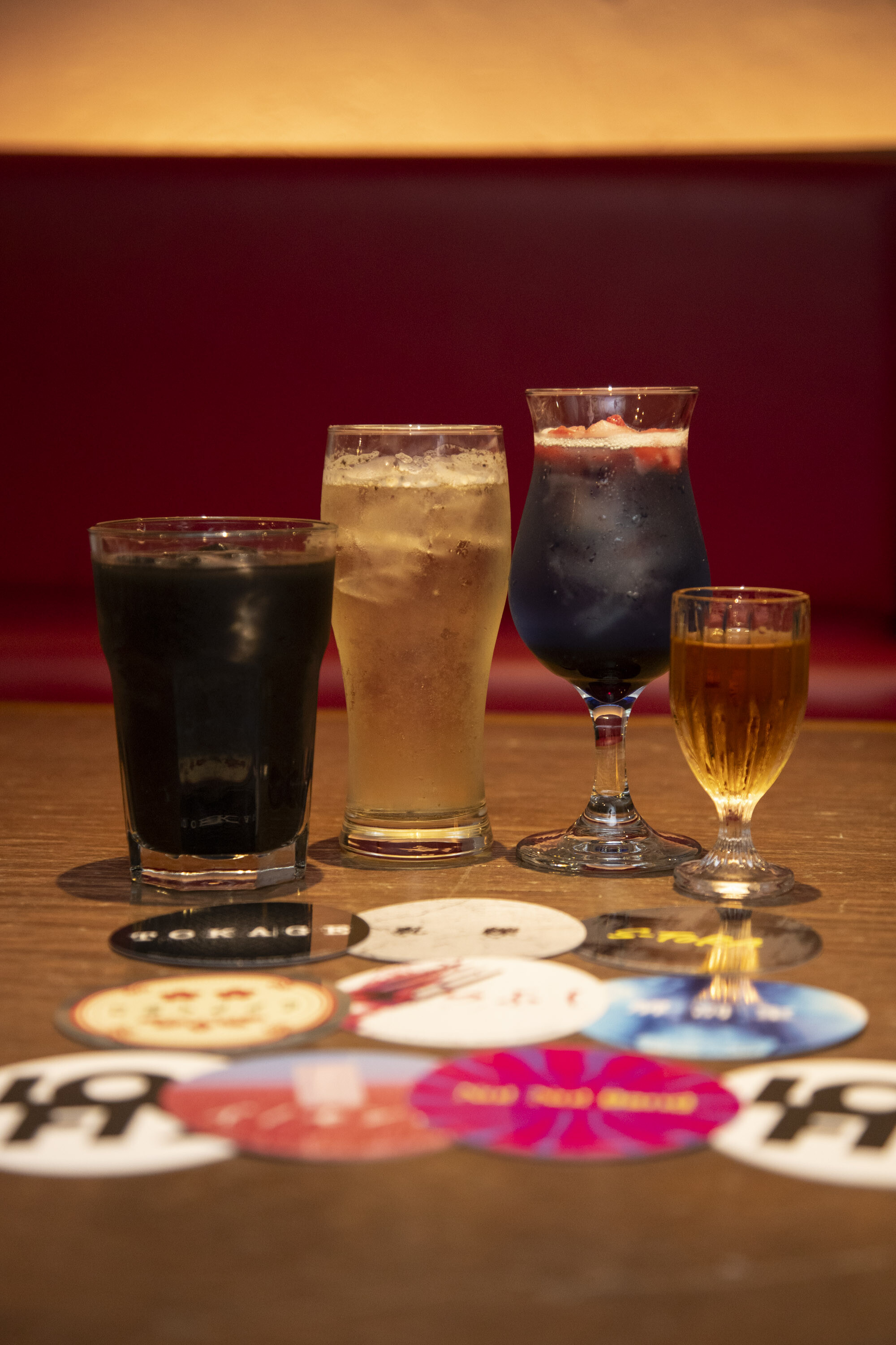 ▲充実のドリンク。左から、PISTOL(黒コーラ)、魔都(ペッパーハイボール)、うめたて(ブルーバタフライピーソーダ)、浅草六区(電気ブラン)|撮影:丸山恵理