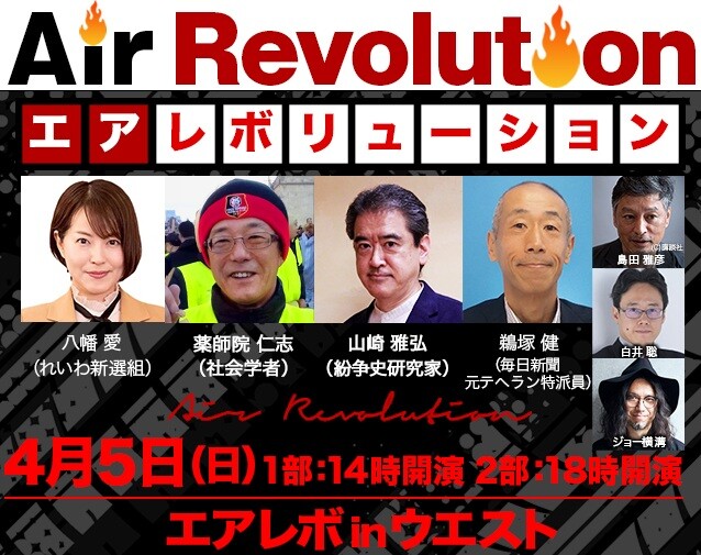 ニコニコ生放送およびYouTubeで配信中の人気言論番組『エアレボリューション』のトークイベント『エアレボ in ウエスト』が、2026年4月5日(日)に大阪・宗右衛門町のロフトプラスワンウエストにて2部構成で開催される。