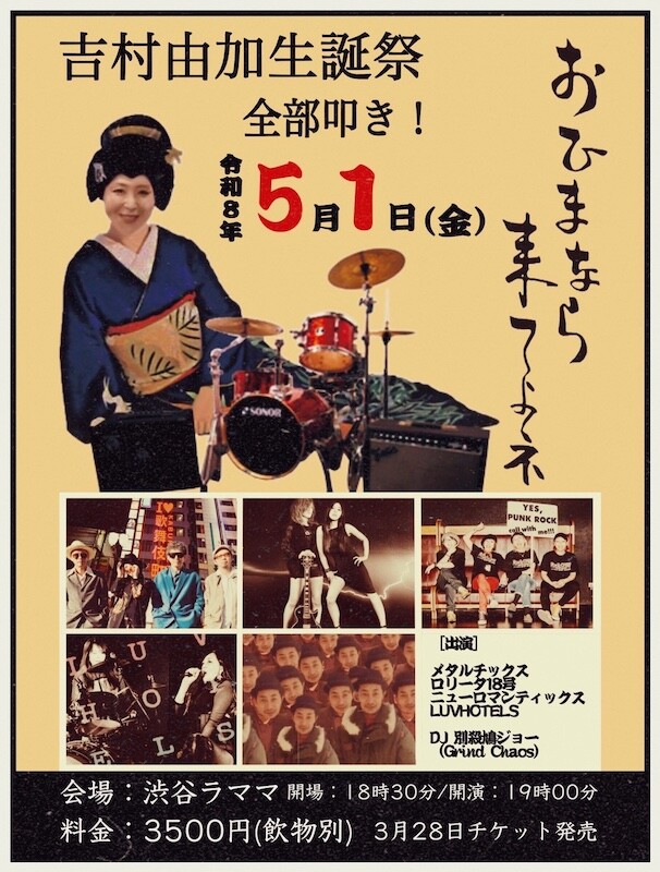 会場は東京・渋谷の老舗ライブハウス渋谷La.mama。タイトルは『吉村由加生誕祭 全部叩き“おひまなら来てよね”』と銘打たれ、節目の年齢や周年とは無関係に「自ら仕切るお祭り」として企画された。