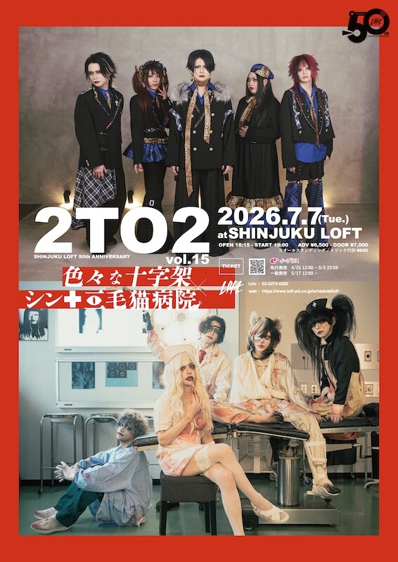 今年、オープン50周年を迎える新宿ロフトの記念公演の一環として行なわれるイベントとして、色々な十字架とシン・三毛猫病院によるツーマンの開催が決定した。来たる7月7日(火)に新宿ロフトで行なわれる。
