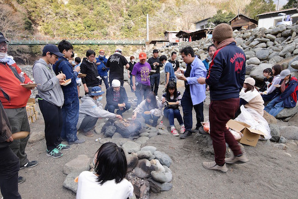 やがて、メンバーとボランティアが団結して作り上げた食事が完成。メンバーは、ボランティアに鍋や肉を振る舞い、全員が自分たちで作った料理の旨さを分かち合う。石のかまどで作られたリアル石焼き芋もホクホク。川に入った人はサウナで温まりと、全員がそれぞれの楽しみ方を満喫している。こうした様子を随時SNSで発信するというのも、新しい形の復興支援の取り組みを多くの人たちに知らせるという意味でとても有効な手段だ。とにかく、参加者全員が笑顔だというのが一番素晴らしいことじゃないだろうか。