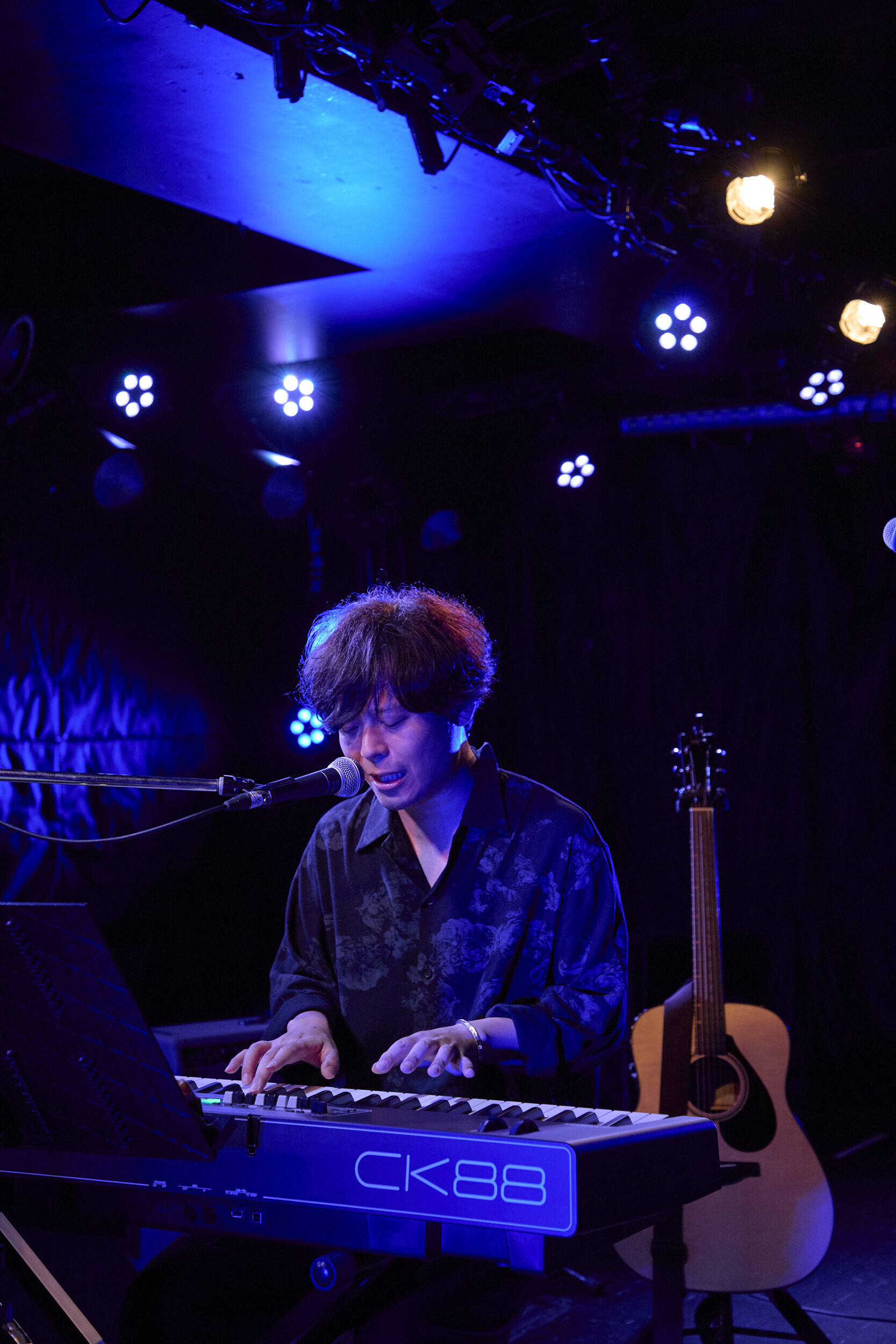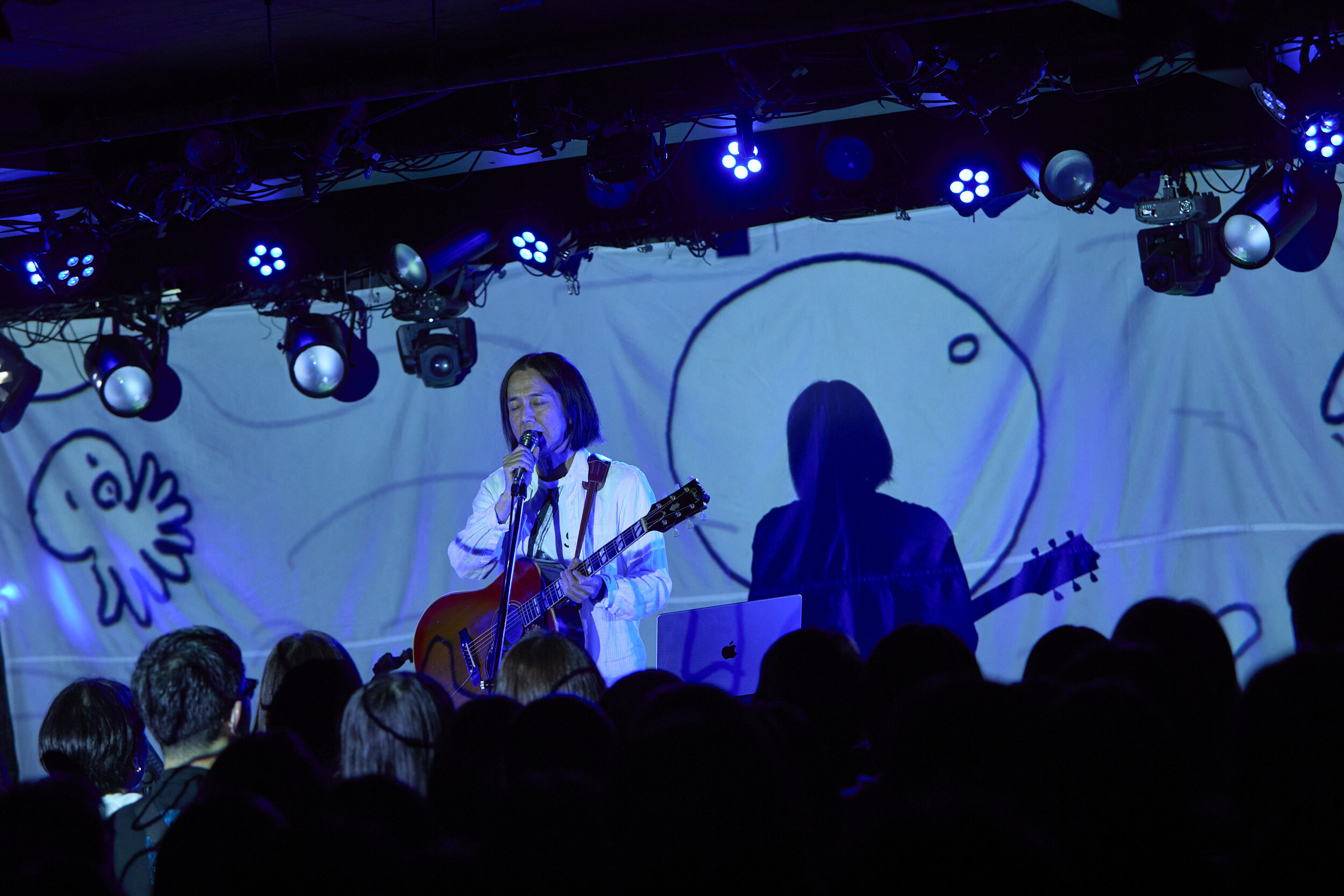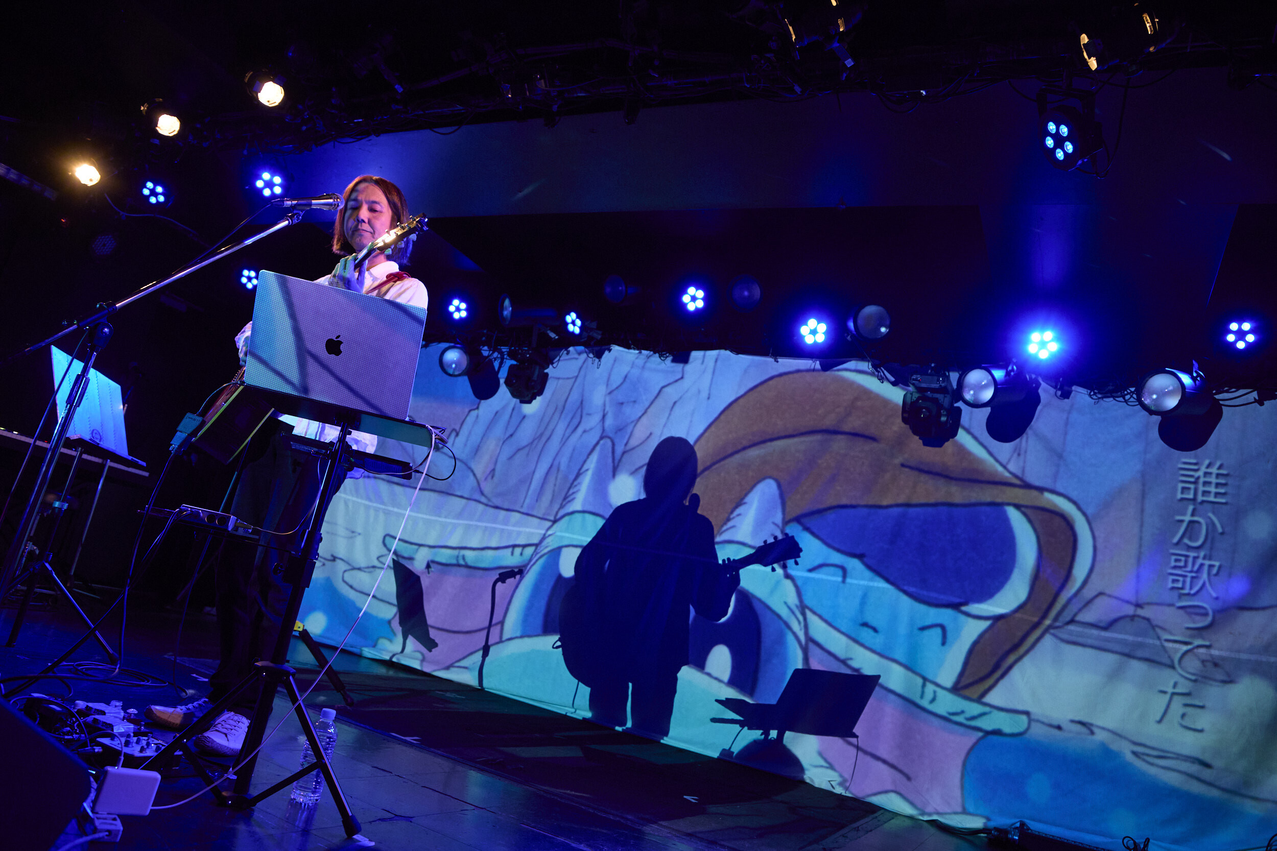 トリを務める高野は、PCを操作してシーケンスを鳴らすと同時に「みなさんこんばんは!」と颯爽と呼びかける。中田曰く「永遠のプリンス」という形容が納得しかないスマートさから繰り出したのは「Wanna be」。ポエトリーリーディングにも近い歌とそこに乗った言葉を絶妙に絡ませ、自作の映像を背後に投射しながらの演奏で浸透させていく。時に大胆に同期音を全面に出してみたり、軽やかなカッティングによる生のグルーヴで迫ったりと、一般に弾き語りと聞いてイメージするものとは一線を画した変幻自在なプレイングだ。2曲目にはタイの漫画家・ウィスット・ポンニミットが手書きで描いたという怪獣や女の子の登場するアニメーションとともに「青い鳥飛んだ」を披露。キラキラとしたシンセポップ調のサウンドに乗るエッジーな風刺と示唆に富んだリリックは、Twitterがある日Xになった出来事から生まれたのだそうで、そのフィロソフィックな視座とアートとしての完成度は圧巻だった。「STAY, STAY, STAY」のオリエンタルとモダンが交錯する音色しかり、大ベテランの域に達しながら鈍ることのない鋭敏なセンスにはあらためて驚かされる。