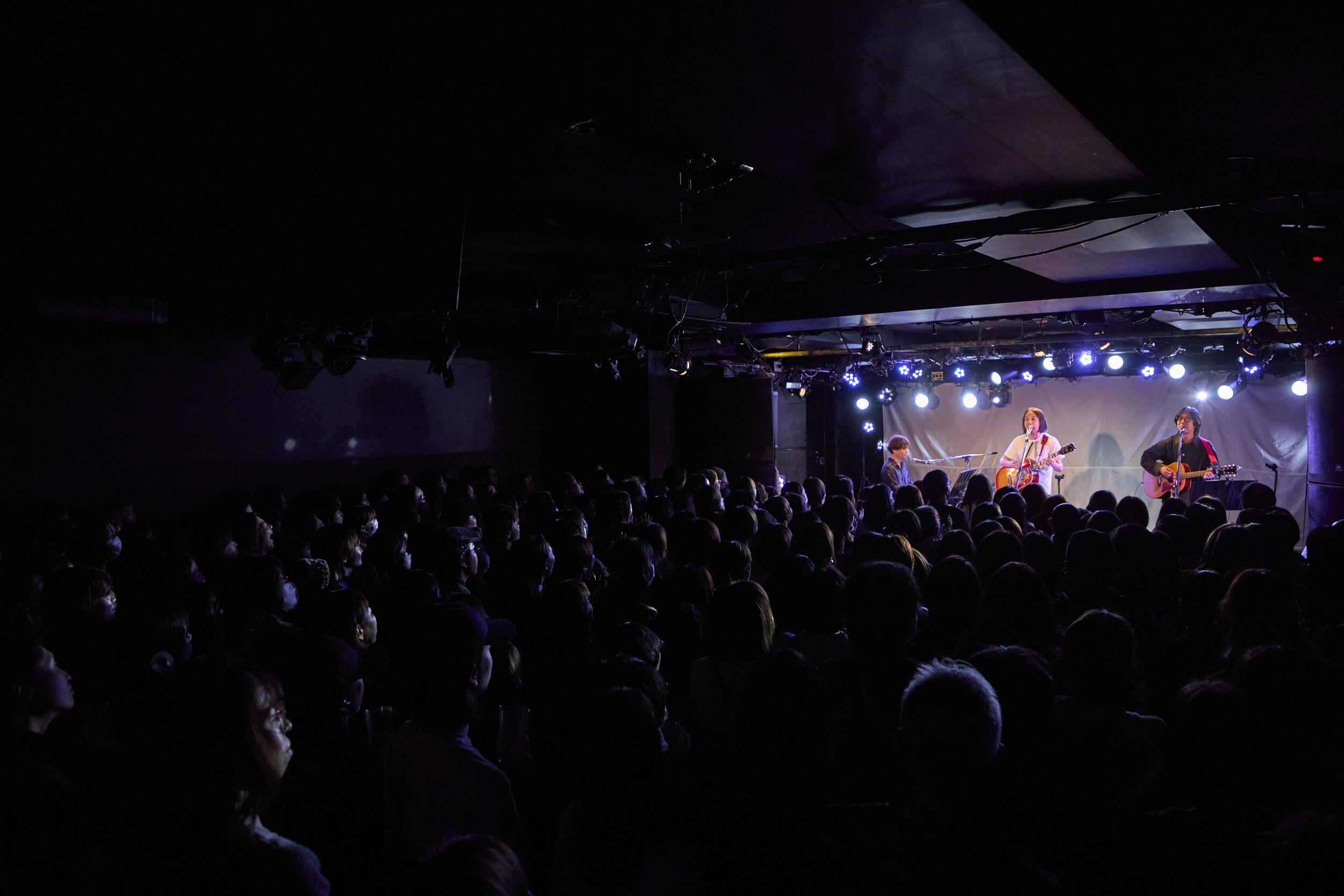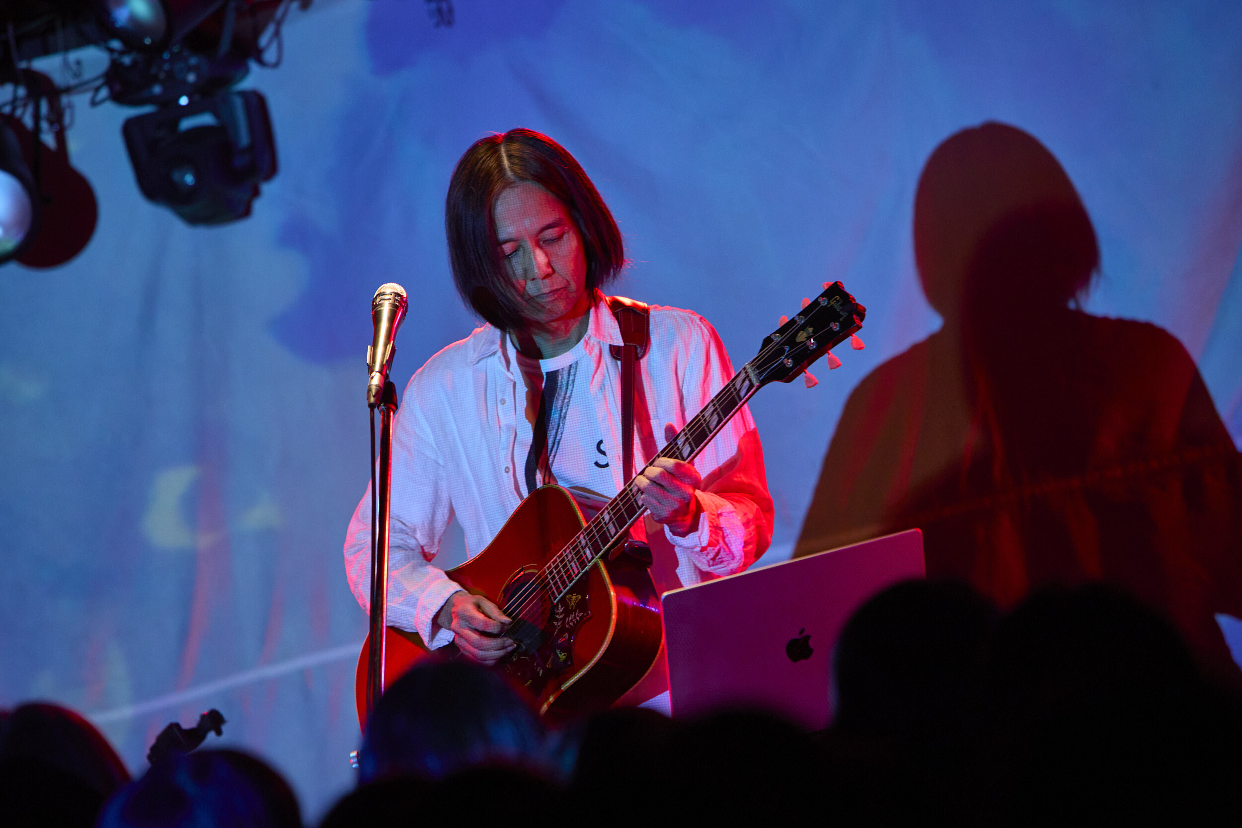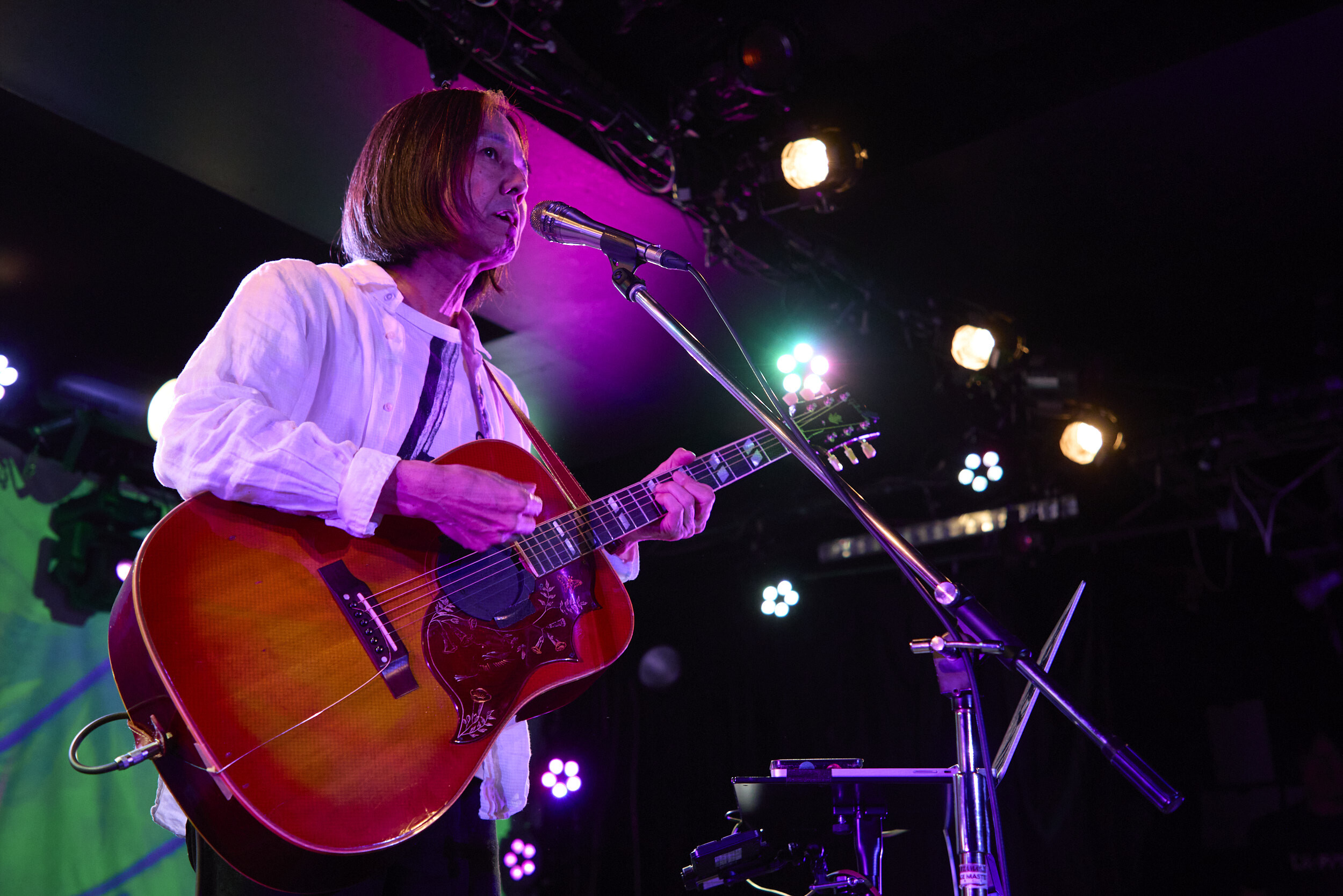 トリを務める高野は、PCを操作してシーケンスを鳴らすと同時に「みなさんこんばんは!」と颯爽と呼びかける。中田曰く「永遠のプリンス」という形容が納得しかないスマートさから繰り出したのは「Wanna be」。ポエトリーリーディングにも近い歌とそこに乗った言葉を絶妙に絡ませ、自作の映像を背後に投射しながらの演奏で浸透させていく。時に大胆に同期音を全面に出してみたり、軽やかなカッティングによる生のグルーヴで迫ったりと、一般に弾き語りと聞いてイメージするものとは一線を画した変幻自在なプレイングだ。2曲目にはタイの漫画家・ウィスット・ポンニミットが手書きで描いたという怪獣や女の子の登場するアニメーションとともに「青い鳥飛んだ」を披露。キラキラとしたシンセポップ調のサウンドに乗るエッジーな風刺と示唆に富んだリリックは、Twitterがある日Xになった出来事から生まれたのだそうで、そのフィロソフィックな視座とアートとしての完成度は圧巻だった。「STAY, STAY, STAY」のオリエンタルとモダンが交錯する音色しかり、大ベテランの域に達しながら鈍ることのない鋭敏なセンスにはあらためて驚かされる。