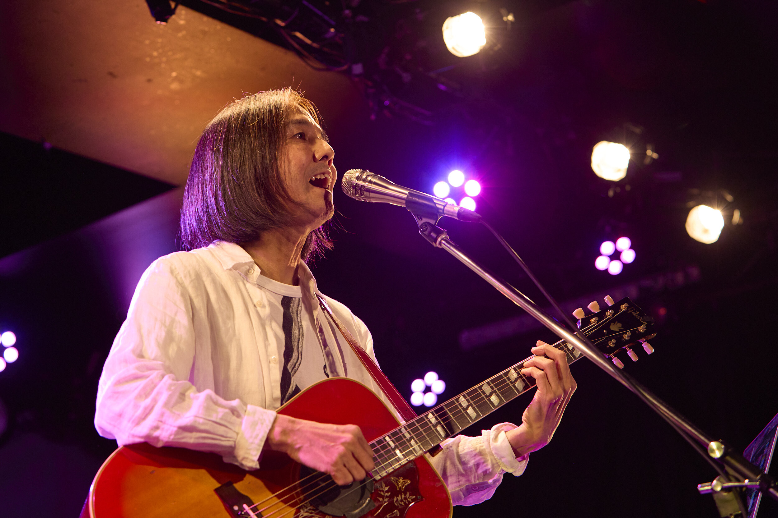 二番手はホリエ。登場するなり「本物の、ホリエアツシです」としっかり伏線を回収して笑いをかっさらう。絵に描いたような寝正月を過ごしていたので、こんなにたくさんの人の前で人見知り状態である──なんて前置きながら、「シーグラス」の一声目から柔らかくも凛然とした歌声で射抜いてくるのだから堪らない。もっとカッコつけようかとも思っていたものの、リハで他2組を観たところ「無理無理!」となってしまい、いちばん有名な曲をいきなりやることにしたのだという、別に言わなくてもいい裏事情まで話してくれるホリエの緩めなテンションもまた、このイベントによく似合っている。本人曰く、中田と高野と並ぶことで自分が「雰囲気と勢いで弾き語りやってることがバレる」とのことだったが、醸し出す親しみやすさや選曲の妙、臨機応変な展開力などホリエの弾き語りでしか味わえない栄養は数知れず。貴ちゃんが今回最初に声をかけたのも、そこへの揺るぎない信頼ゆえであることは想像に難くない。