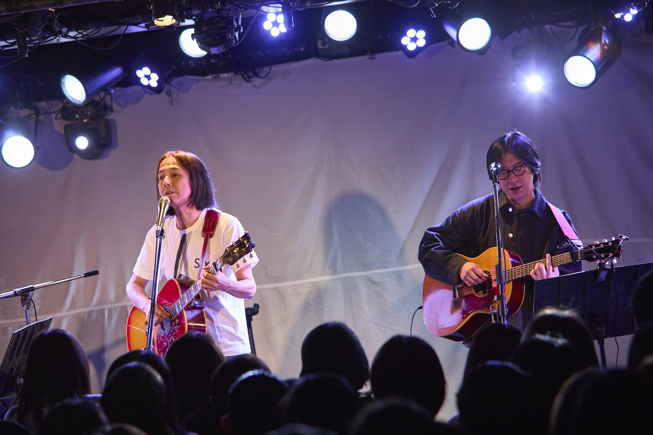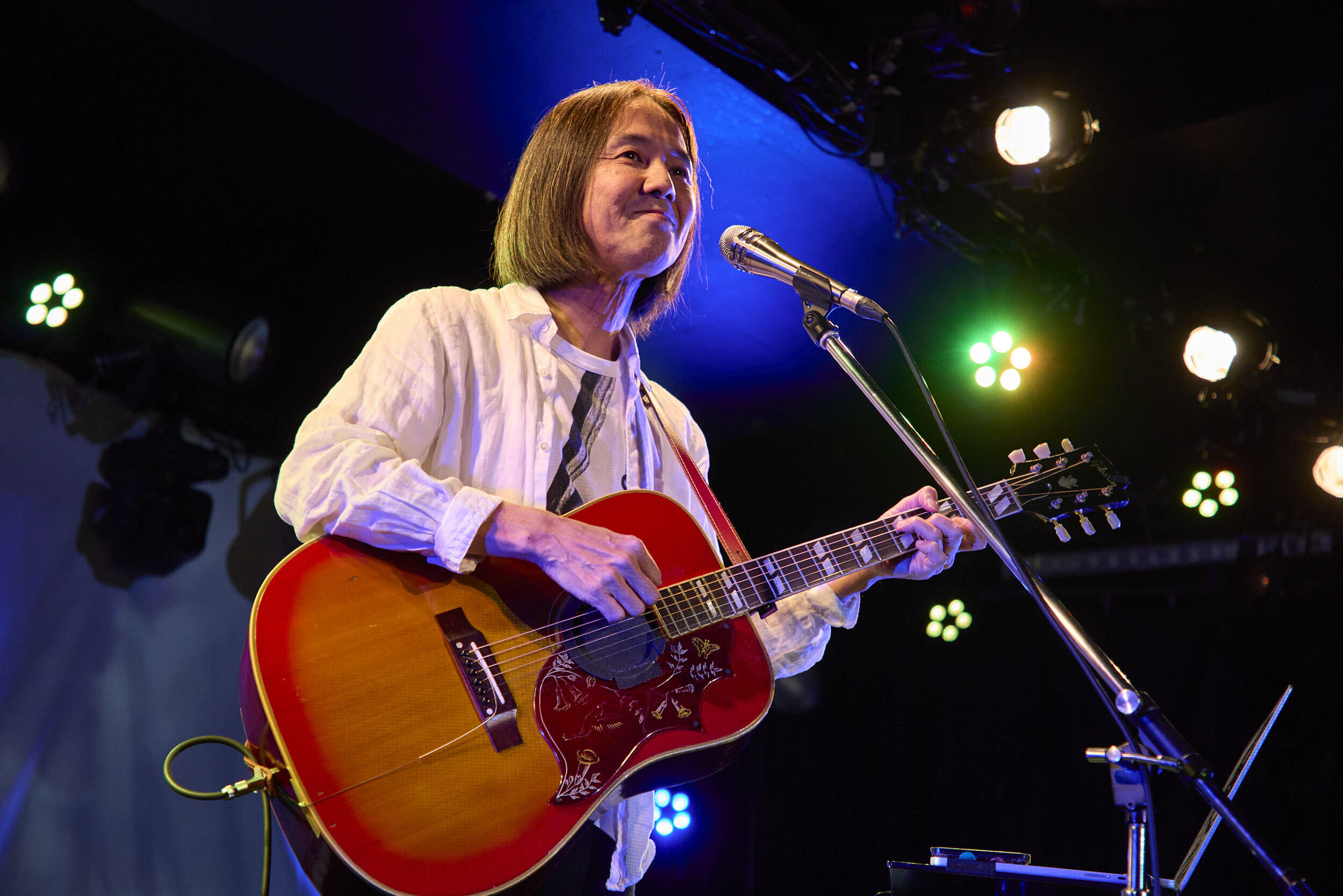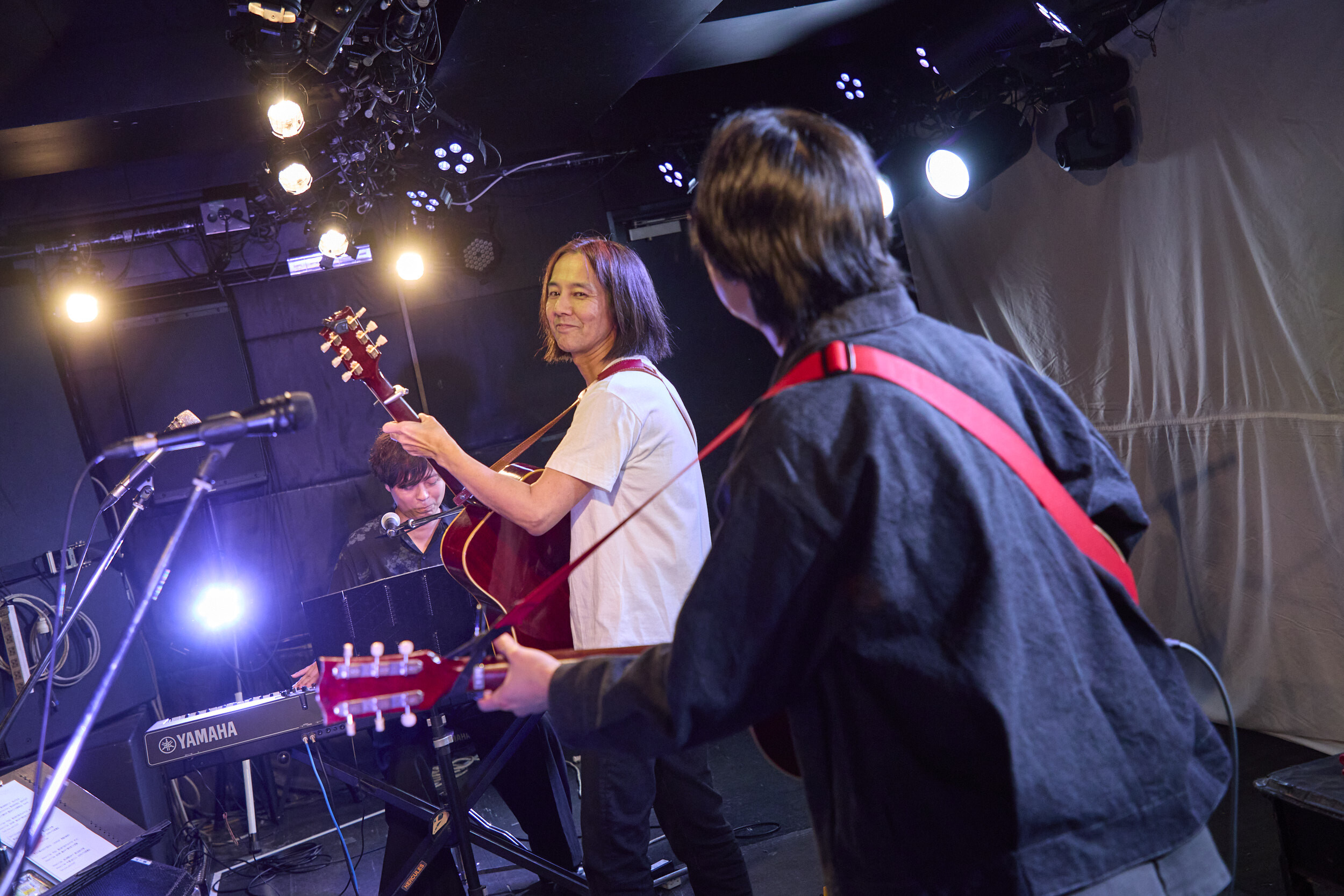 一番手は中田。見間違えたのかジョークだったのかは定かではないが、何故かフロアから飛んだ「ホリエさーん!」の呼び声に中田が思わず吹き出し、「こんなにやりづらい始まり……(笑)」なんてボヤきながらも冒頭から場の空気が一気に和む。ただ、ひとたび演奏が始まれば空気は一変。威勢よくコードを鳴らすのではなく爪弾くようにラテン系のノリを加えたギタープレイとともに「GARIGARI」を歌い出すと、艶やかでありながらパンチの効いた歌声が場内を満たす。モダンな要素とブルージーな渋みが一体となったグルーヴは唯一無二だ。アコギに持ち替え、「明けましておめでとうございます、ストレイテナーのホリエアツシです」と気の利いた挨拶を挟んで「ビターネス」へ。弾むカッティングからは、場の空気と鳴る音を楽しみながらのプレイであることがよく伝わってきて、自然とこちらのテンションも上がっていく。