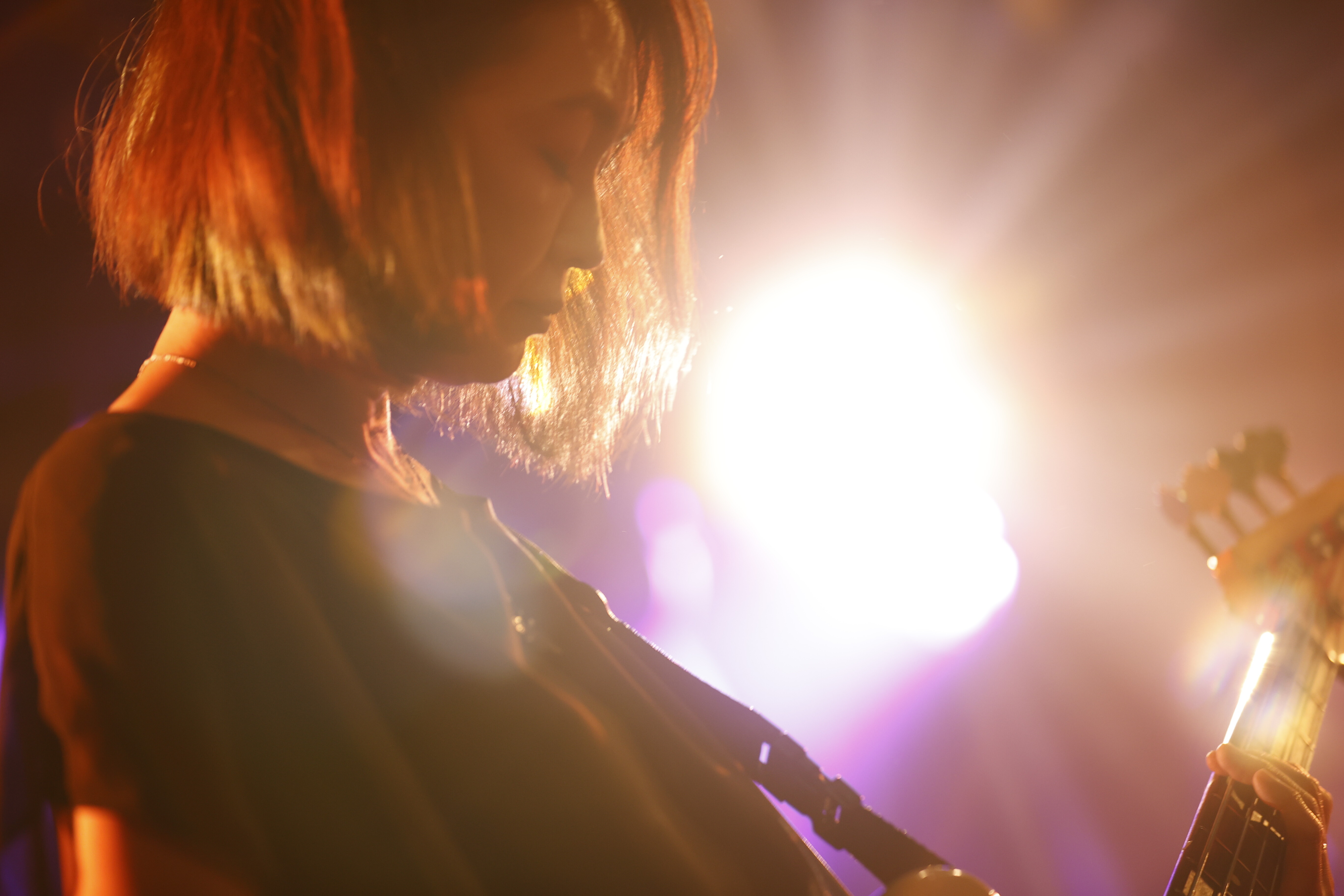 観客に耳を傾けさせた「薄紫」のしっとりとした気分を変えるため、いつもなら「調子はどうだい」を景気よく演奏するところを、この日は、スウィングする「夜しか泳げない」を、観客も含め、全員で歌う。キュウちゃんことクハラカズユキ(Dr)が軽快に鳴らすシャッフルのリズムと中西智子(Ba)が迫力ある低音で刻むウォーキングベースもゴキゲンだ。